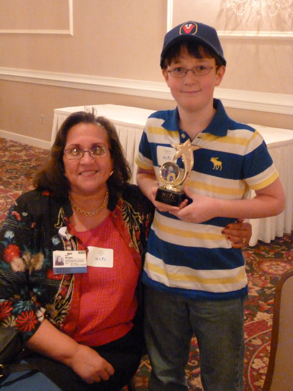 Gail Wright, MCIC Vice Chair is pictures with Robert Till, the first ever V-Team Champion Award recipient.  The award was presented to Robert on May 8th at the Annual Immunization Update Dinner.  Robert has been volunteering with the V-Team since the very beginning and this past year created a video introducing Victor Vaccine to the world as a school project.  His video can be found on youtube.  The MCIC Steering Committee wanted to acknowledge all of Robert’s efforts and decided to create an award, V-Team Champion Award.  Also pictured is Robert being surprised at school by Victor Vaccine live on closed circuit television during the morning announcements.  Also pictured with Robert is his school nurse, Jackie Raco.